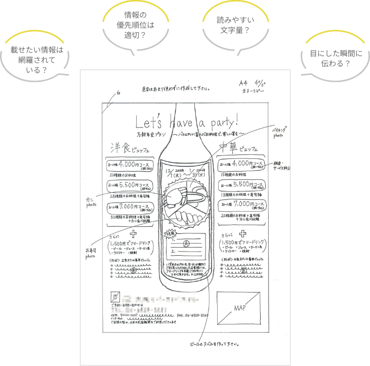 伝えたいメッセージが正しく伝わるように、まずは「色」や「あしらい」などのデザイン要素がない状態で情報を整理していきます。
